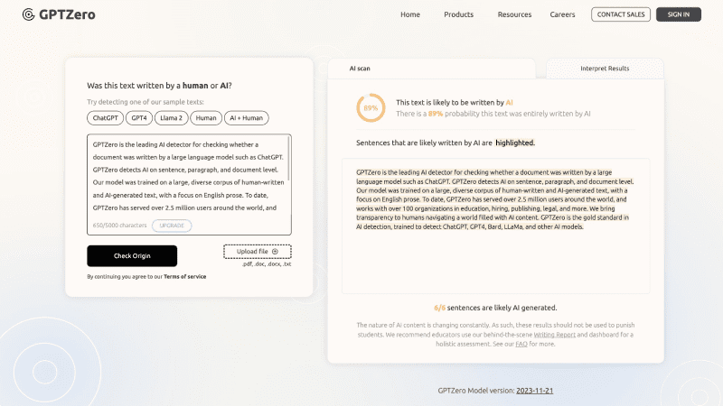 GPTZero不限于 ChatGPT,还支持 GPT-4、GPT-3、GPT-2、LLaMA 以及基于这些模型的 AI 服务。