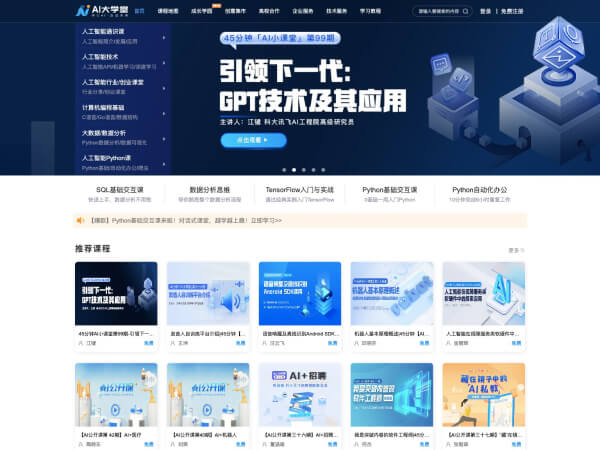 AI大学堂是由讯飞开放平台打造的人工智能专业学习、交流和培训的AI学习平台。作为开发者专属的AI学习平台,旨在为 AI 领域开发者、爱好者提供丰富的资源、专业的课程以及共享的服务。AI大学堂提供专业、有趣、实用的AI课程,让你找到丰富优质的AI学习教程。网站上也会定期开展未来课栈、精品课堂、AI创学社等众多线下活动,并举办AI开发者大赛,开放讯飞专业技术能力,玩转百变算法。